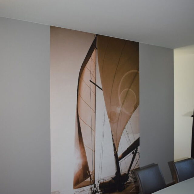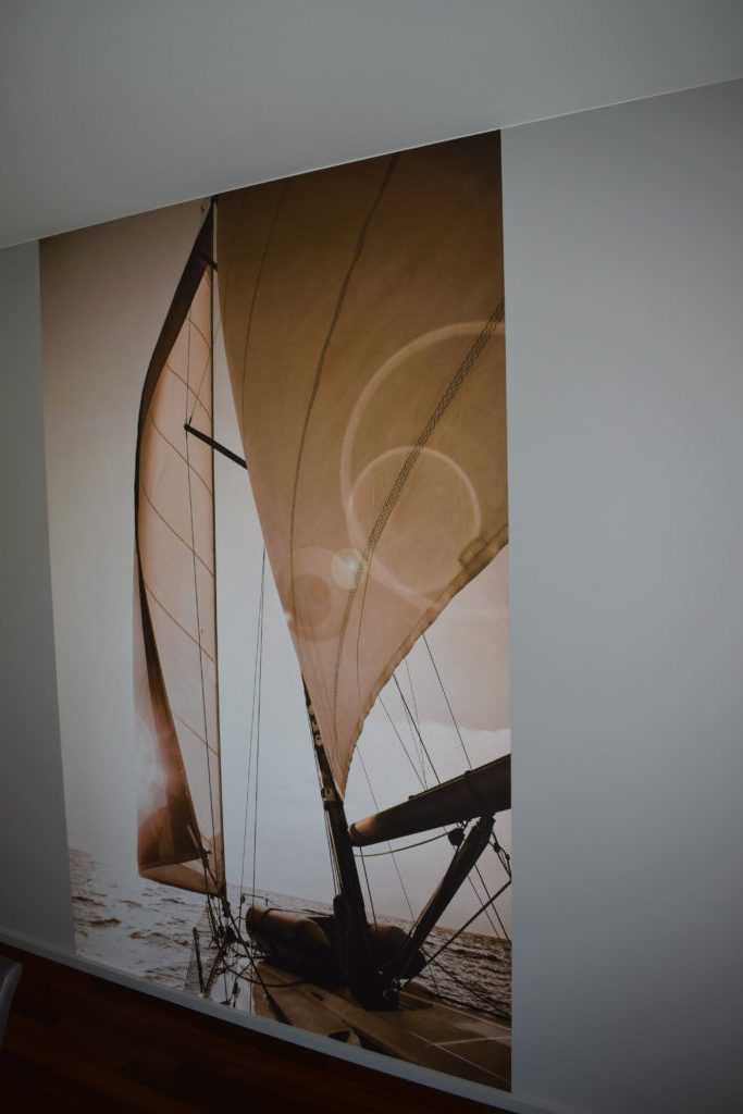 Durch die Kombination aus hochwertiger Fototapete (Segelmotiv) und strukturierter Mustertapete entstand ein harmonischer, wohnlicher Akzent mit viel Tiefe und Charakter.